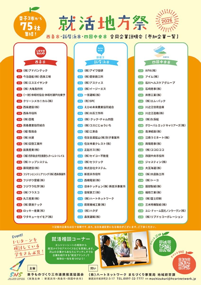 新居浜市・西条市・四国中央市にある75社もの企業が参加する合同企業説明会となります。